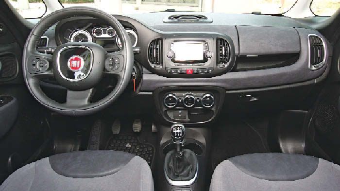 Οι σχεδιαστές του Fiat 500L, έπαιξαν αρκετά με τους όγκους, κάνοντας μεγάλα ανοίγματα στις πόρτες και πολύ ψηλό το εσωτερικό. Έτσι ο επιβάτης μπαίνει και βγαίνει πολύ εύκολα χωρίς να σκύψει, περιβάλλεται από μεγάλα παράθυρα, ενώ η (προαιρετική) τεράστια ηλιοροφή χαρίζει επιπλέον φως και αέρα. Οι προσφερόμενοι χώροι για αυτούς είναι μεγάλοι κι άνετοι και πληθωρικοί για τα γόνατα των πίσω επιβατών. Από εκεί και πέρα, τα πίσω καθίσματα αναδιπλώνονται τελείως με ένα μοχλό μεγαλώνοντας το χώρο αποσκευών.