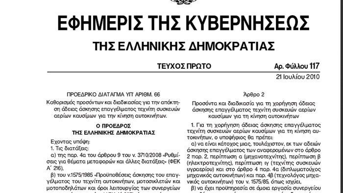 Με το προεδρικό διάταγμα 66/2010 «Καθορισμός προσόντων και διαδικασίας για την απόκτηση άδειας άσκησης επαγγέλματος τεχνίτη συσκευών αερίων καυσίμων για την κίνηση αυτοκινήτων», ξεκαθαρίζονται όλα τα απαιτούμενα προσόντα που πρέπει να έχει ο υποψήφιος τεχνίτης, όπως: