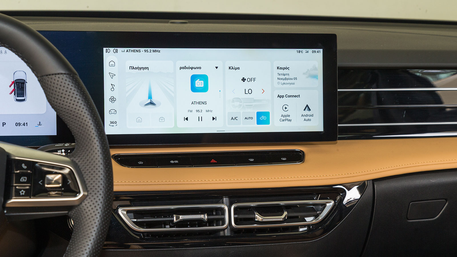 Μπαίνοντας στο εσωτερικό του νέου MG HS, η αλλαγή σε σχέση με το προηγούμενο μοντέλο είναι άμεσα αισθητή. Η συνολική εικόνα αποπνέει σαφώς πιο ποιοτική και σύγχρονη ατμόσφαιρα, με αναβαθμισμένα υλικά και πιο προσεγμένες λεπτομέρειες στη συναρμογή. Η νέα σχεδίαση του ταμπλό είναι πιο καθαρή και μοντέρνα, με την οριζόντια διάταξη να ενισχύει την αίσθηση πλάτους, ενώ η μεγάλη οθόνη αφής 12,3” στο κέντρο τραβά το βλέμμα και λειτουργεί ως το τεχνολογικό επίκεντρο της καμπίνας. Ο ψηφιακός πίνακας οργάνων – επίσης 12,3” – προσφέρει καθαρή απεικόνιση και δυνατότητα παραμετροποίησης, ενώ τα νέα καθίσματα συνδυάζουν καλύτερη στήριξη με αναβαθμισμένα υλικά επένδυσης.
