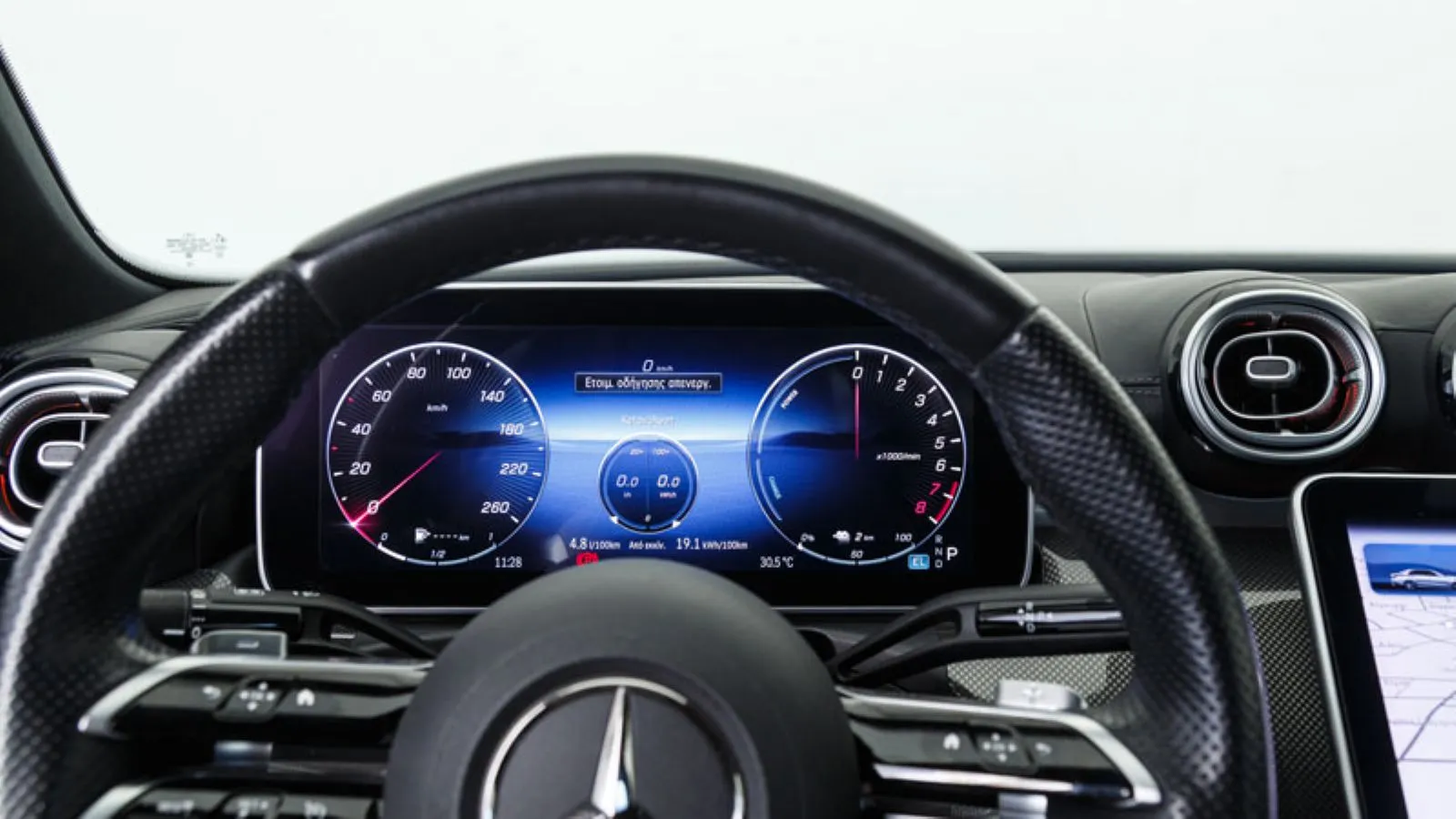 Αυτή είναι τεχνολογίας OLED, έχει υψηλή ανάλυση και διάσταση 11,9 ίντσες. Από πάνω βρίσκονται 3 στρογγυλοί αεραγωγοί, σήμα-κατατεθέν των εσωτερικών των μοντέρνων Mercedes, οι οποίοι είναι εμπνευσμένοι από τους κινητήρες των αεροπλάνων και συμπληρώνονται από άλλους 2 που είναι στις άκρες του ταμπλό. Πίσω από το δερμάτινο τιμόνι με τα πλήκτρα αφής στις διπλές ακτίνες του υπάρχει ο ψηφιακός πίνακας οργάνων 12,3 ιντσών, που διαθέτει επίσης γραφικά υψηλής ανάλυσης και είναι παραμετροποιήσιμος ως προς τις προβολές του.