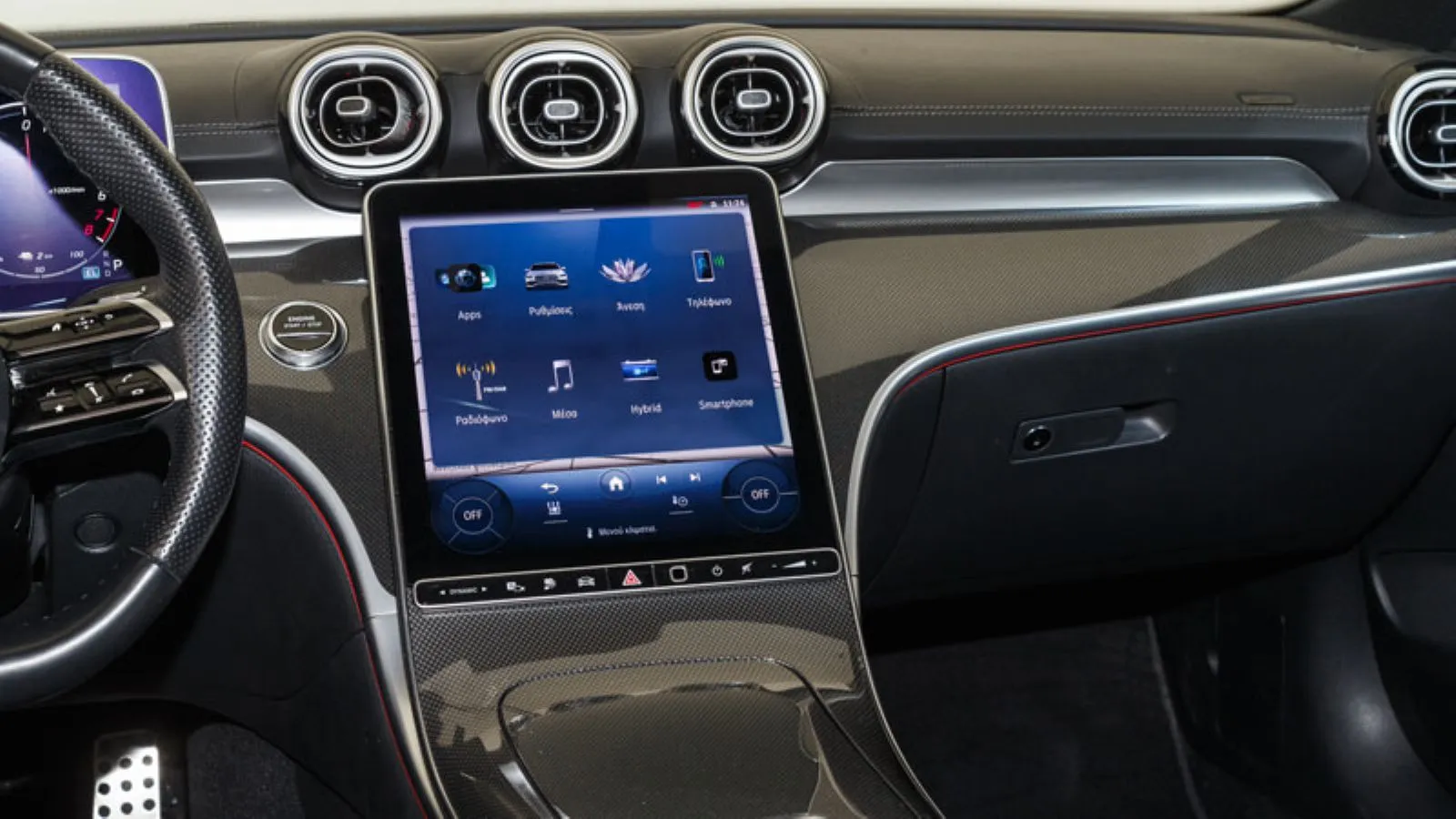 Η καμπίνα της Mercedes C400e 4MATIC εντυπωσιάζει, τόσο με το σχεδιασμό όσο και με τον τεχνολογικό «αέρα» που έχει. Η κεντρική κονσόλα ανάμεσα στα καθίσματα είναι ψηλή και προεκτείνεται έντεχνα στο ταμπλό, στο κέντρο του οποίου δεσπόζει η μεγάλη κάθετη οθόνη αφής του συστήματος infotainment.
