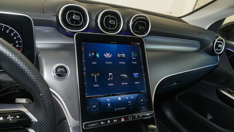 Στην καμπίνα της Mercedes GLC 300 e 4MATIC Coupe είναι έκδηλη η «αύρα» πολυτέλειας, χάρη στα άκρως ποιοτικά υλικά που έχουν χρησιμοποιηθεί, τον ατμοσφαιρικό φωτισμό, και τη μεγάλη κάθετη οθόνη διάστασης 11,9 ιντσών για το σύστημα infotainment. Η τελευταία, σε συνδυασμό με τον ψηφιακό πίνακα οργάνων 12,3 ιντσών, αμφότερα υψηλής ανάλυσης, εντείνει το τεχνολογικό στοιχείο του αυτοκινήτου.