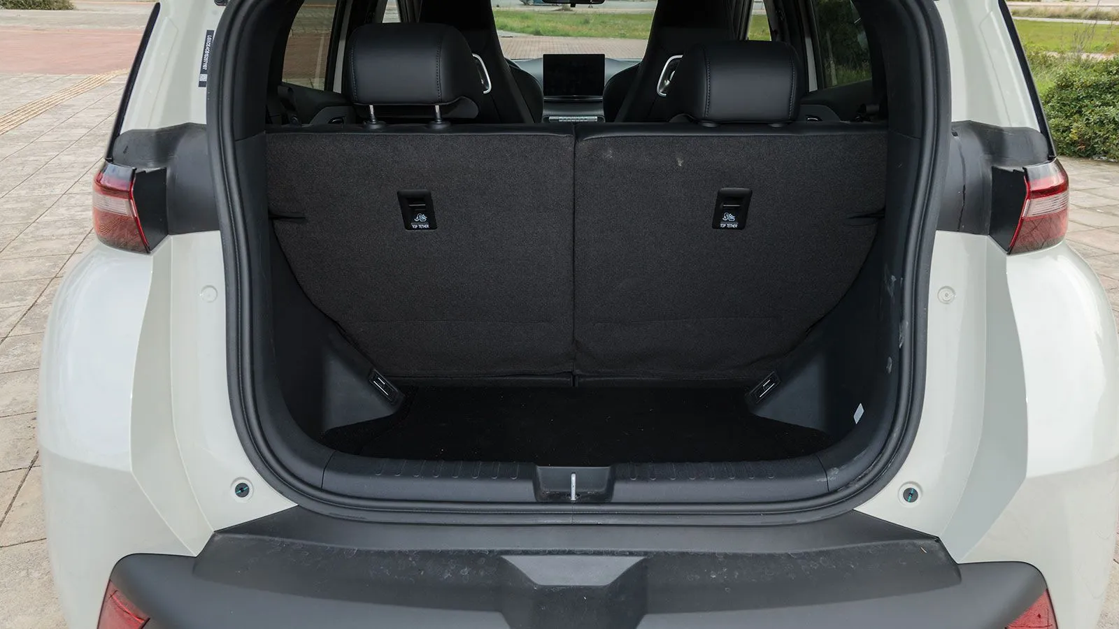 Όσο για τους χώρους, αναλυτικότερα, μπορεί να θεωρηθεί ως ένα από τα πιο άνετα μικρά ηλεκτρικά της αγοράς. Ο χώρος μπροστά από τα γόνατα των πίσω επιβατών είναι ο περισσότερος στην κατηγορία (14,5 εκ.), ενώ ο διαθέσιμος χώρος πάνω από το κεφάλι τους (6 εκ.) εξασφαλίζει άνεση ακόμα και για ψηλότερους επιβάτες στο πίσω μέρος. Δεν ξεχωρίζει σε φάρδος του πίσω καθίσματος (1,23 μ.), αλλά δεν αναμένεται να χρησιμοποιείται καθημερινά για την μεταφορά τριών ενηλίκων. Πάντως, τρεις μικρόσωμοι επιβάτες ή τρία παιδιά θα βολευτούν. Επίσης, το πίσω κάθισμα είναι διαιρούμενο (40/60), προσφέροντας ευελιξία στον συνδυασμό επιβατών και αποσκευών. Θετικό στοιχείο, λοιπόν, και το πορτμπαγκάζ του, εφόσον τα 308 λτ. (βάση δηλώσεων του κατασκευαστή) είναι από τα μεγαλύτερα νούμερα στην κατηγορία. Ομολογουμένως, μοιάζει μικρότερο στην πράξη και έχει υψηλό κατώφλι φόρτωσης.