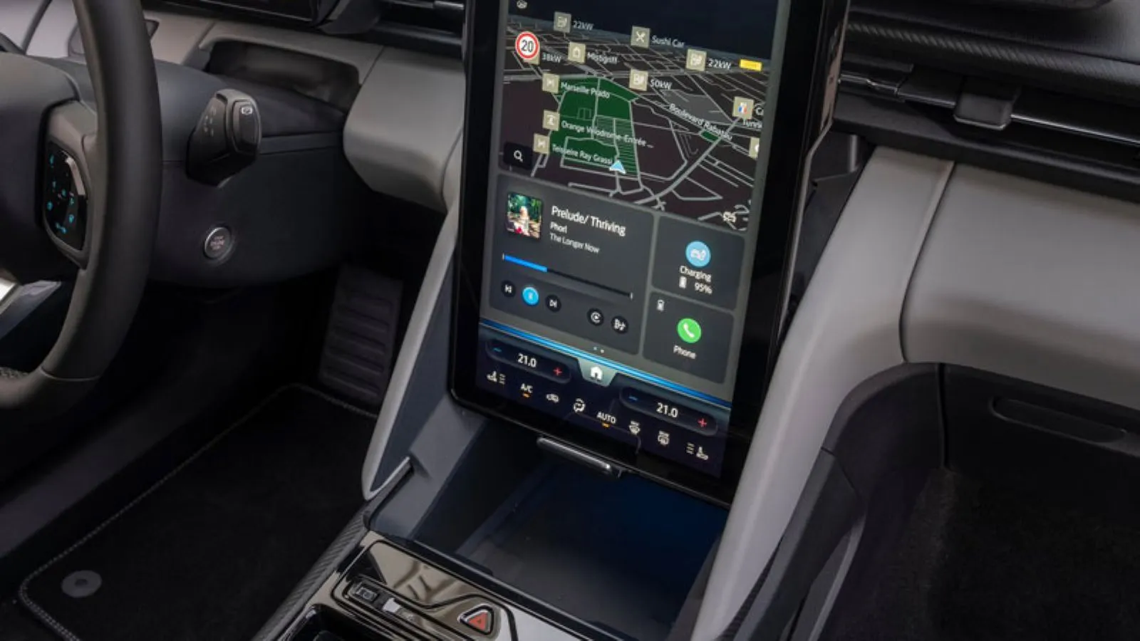 Εδώ το Ford Capri δεν απογοητεύει: Στο καλοσχεδιασμένο εσωτερικό, στο οποίο έχει γίνει χρήση ποιοτικών υλικών, δεσπόζει η μεγάλη και κάθετη οθόνη για το σύστημα infotainment, που έχει διάσταση 14,6 ίντσες και είναι ρυθμιζόμενη ως προς την κλίση επάνω-κάτω, προκειμένου να την τοποθετήσετε ακριβώς στο σημείο που προτιμάτε. Επιπλέον, αν μετακινηθεί πλήρως προς τα επάνω, αποκαλύπτει έναν έξτρα αποθηκευτικό χώρο που ονομάζεται My Private Locker.