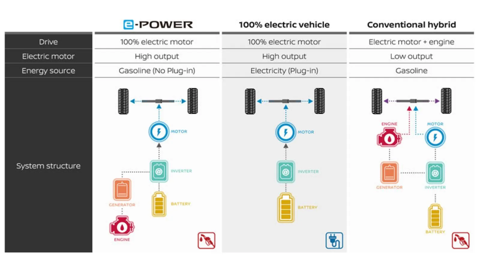 Αυτό έχει ως αποτέλεσμα η λειτουργία του συνόλου να είναι αθόρυβη, και ταυτόχρονα η απόκριση στο γκάζι να είναι άμεση. Αμφότερα τα χαρακτηριστικά μέχρι τώρα ήταν «αρετές» μόνο των αμιγώς ηλεκτρικών οχημάτων, τα οποία βέβαια έχουν τον περιορισμό τόσο του δικτύου, όσο και του χρόνου φόρτισης. Στο σύστημα της Nissan, ο ανεφοδιασμός γίνεται αποκλειστικά με βενζίνη, όπως στα «κανονικά» θερμικά οχήματα.