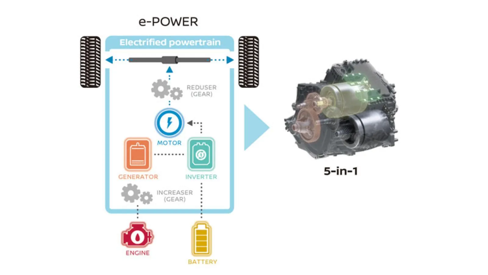 Το σύστημα μετάδοσης είναι το e-POWER 3ης γενιάς, το οποίο χαρακτηρίζεται «5-σε-1», μιας και ενσωματώνει τον ηλεκτροκινητήρα, τη γεννήτρια, το μετατροπέα (inverter), το μειωτήρα και τον «αυξητή» σε ένα σύνολο, το οποίο είναι πιο «μαζεμένο» σε διαστάσεις και ταυτόχρονα κατά 28 κιλά ελαφρύτερο σε σχέση με πριν. Αυτό βρίσκεται στο εμπρός μέρος του Qashqai, δίπλα από τον κινητήρα.